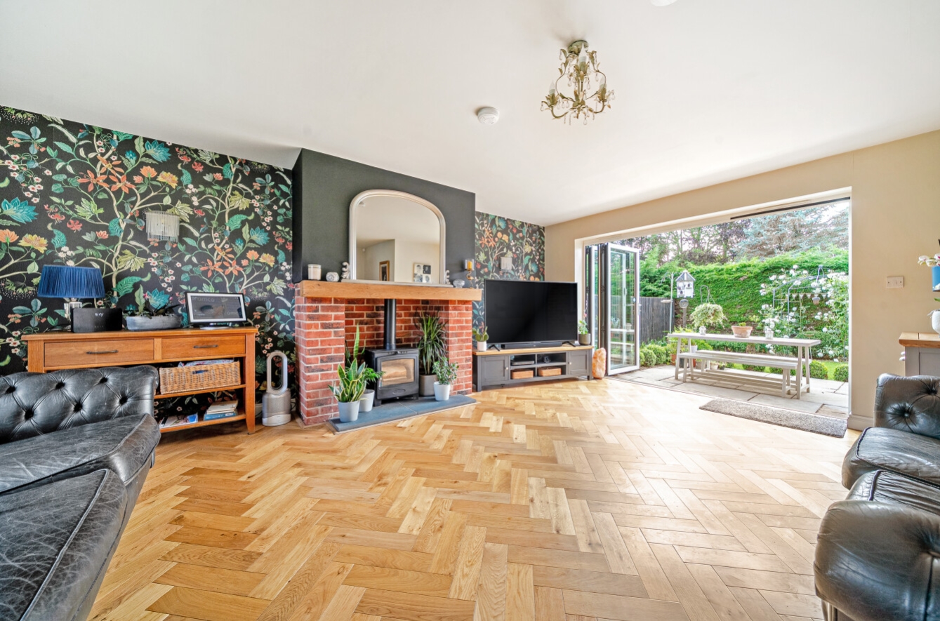 The heart of the home is the impressive family dining kitchen—a contemporary open-plan space that blends function with style. It features a lounge area with fireplace and wood-burning stove, solid wood floors, and bi-fold doors that open out to the garden, creating the perfect setting for entertaining or family life. The kitchen itself is beautifully appointed with an island unit and a full range of integrated appliances, including a fridge freezer, microwave, oven, dishwasher, and Insinkerator. A separate utility room provides additional storage and practicality.