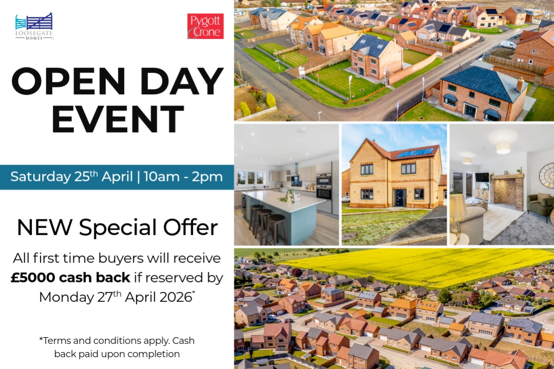 “OPEN DAY EVENT – Saturday 25th April 10am – 2pm. Where your next chapter begins-Join us for an open day to explore your new home. Open day offer: All First time buyers will receive a £5,000 cashback on completion if reserved by 27th April. Varity of styles, sizes and prices on offer. All Welcome. “