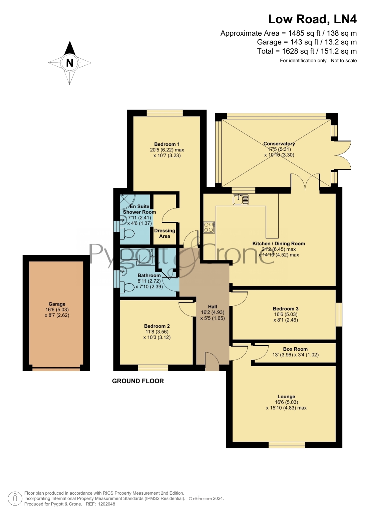 The accommodation extends to some 1,485sqft and briefly comprises Hallway, Lounge, Box Room, large Kitchen Dining Room, Conservatory, Three generous Bedrooms, the main having a Dressing Area and En Suite Shower Room together with a main Bathroom with a shower over the bath.