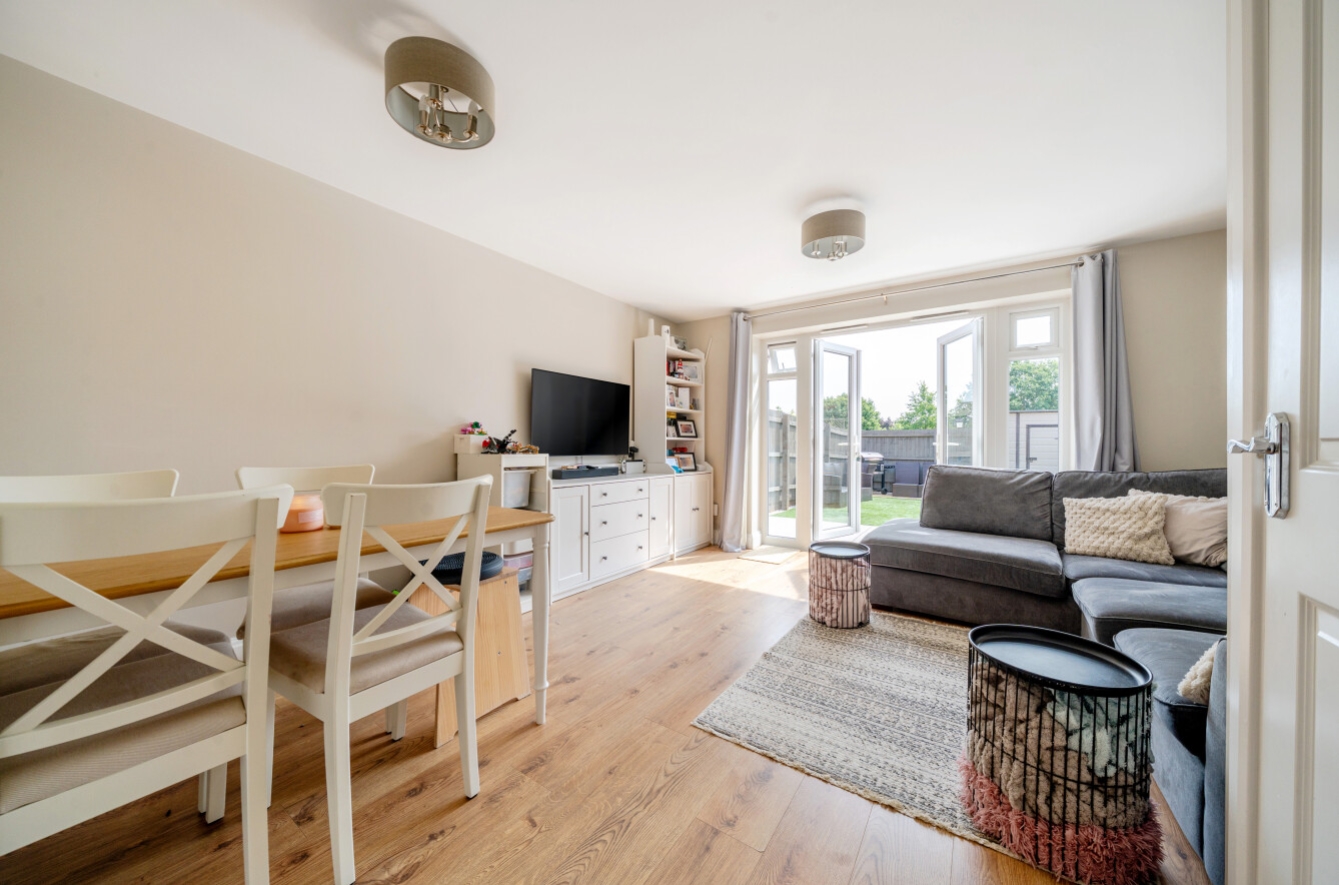 The accommodation includes a welcoming entrance hall, downstairs WC, a modern fitted kitchen, and a spacious lounge/diner with French doors opening out to the rear garden. Outside, the garden is designed for low maintenance with a patio seating area, artificial lawn, gated side access, and an outdoor water tap—ideal for entertaining or relaxing. Upstairs, there are two well-proportioned double bedrooms and a contemporary family bathroom.