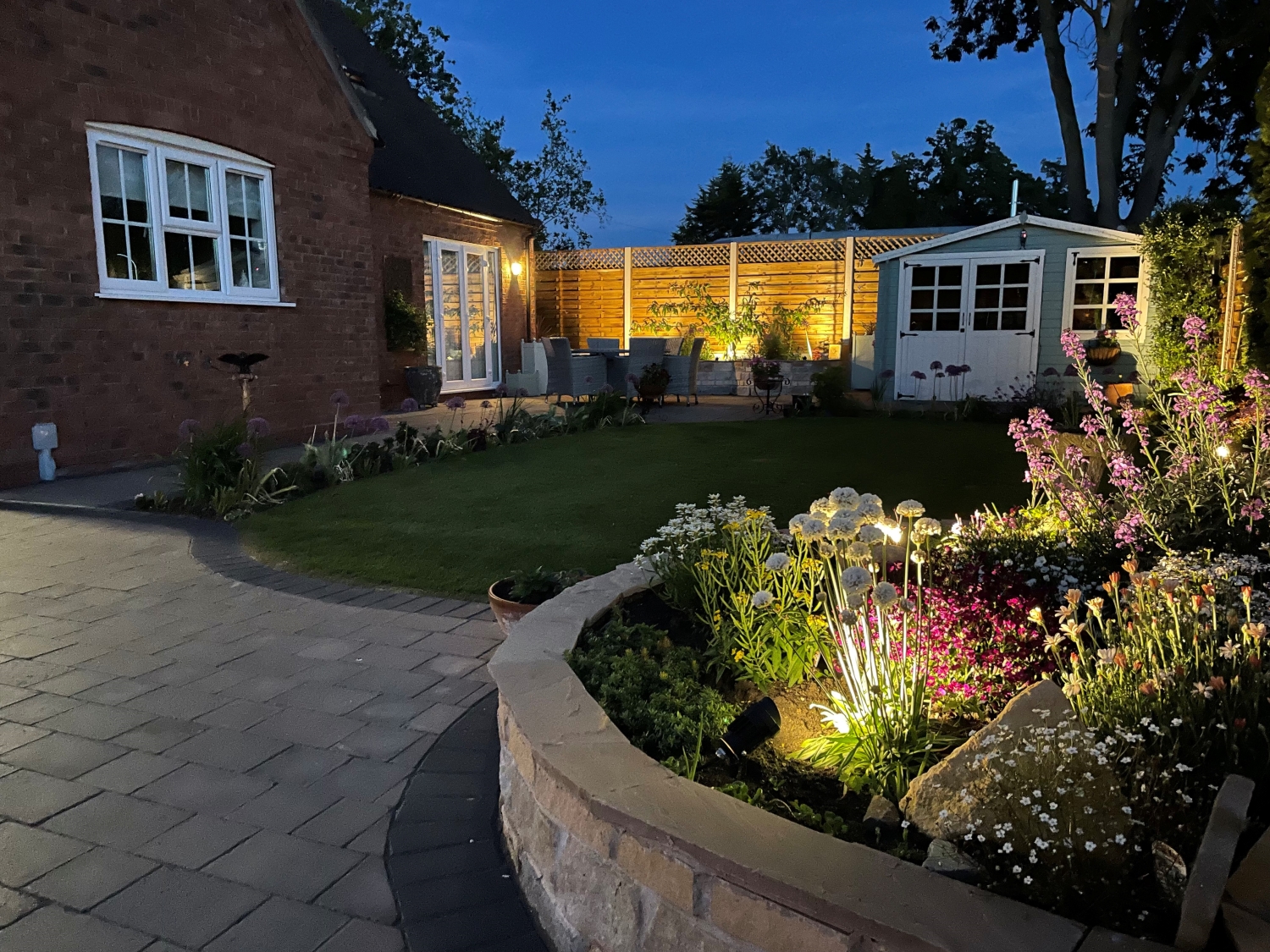 Outside the property is accessed through a pair of gates on to an extensive block paved driveway providing parking and leading to the detached double garage with electric doors. The gardens are a particular feature having been attractively landscaped wrapping around the front, side and rear. They comprise lawn together with well stocked flower beds. The rear gardens are west facing and offer a good level of seclusion.