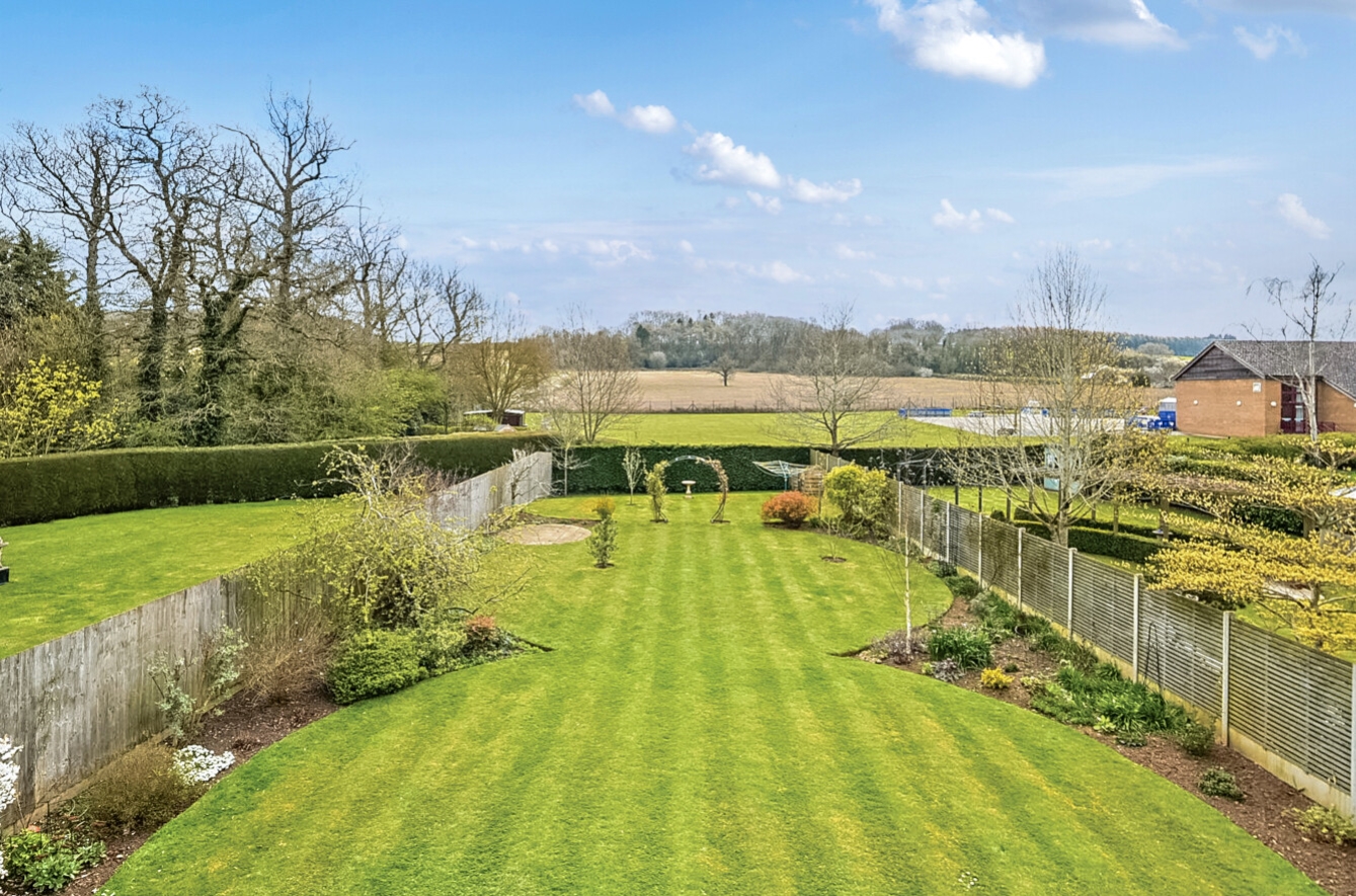 Externally, the property is approached via a gravelled gated driveway providing off-road parking for up to three vehicles and leading to the double garage. The rear garden is a particular highlight, being south-facing and enjoying uninterrupted open field views. Beautifully maintained, it features two patio seating areas, immaculate lawned sections, well-stocked flower beds and a selection of fruit trees, offering a perfect space for relaxation and entertaining.