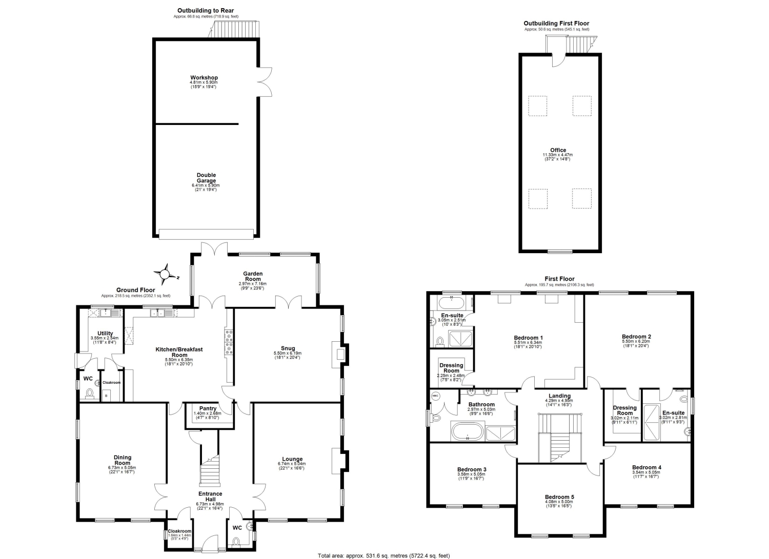 On the first floor, the generous landing mirrors the space below and leads to five double bedrooms. The principal bedroom features an en-suite shower room and a separate dressing room, while the second bedroom also benefits from its own dressing room and en-suite. The remaining bedrooms are all of good proportions, and the family bathroom completes the accommodation on this floor.