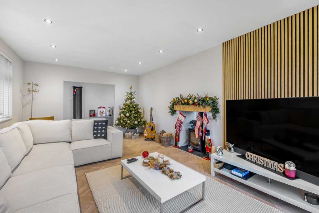 The accommodation is thoughtfully arranged and flows well throughout the home. The lounge is a bright and welcoming space, featuring bi-folding doors opening out to the rear garden, creating a strong connection between indoor and outdoor living. A striking dual-sided wood-burning stove sits between the lounge and kitchen, forming an impressive focal point that can be enjoyed from both rooms.