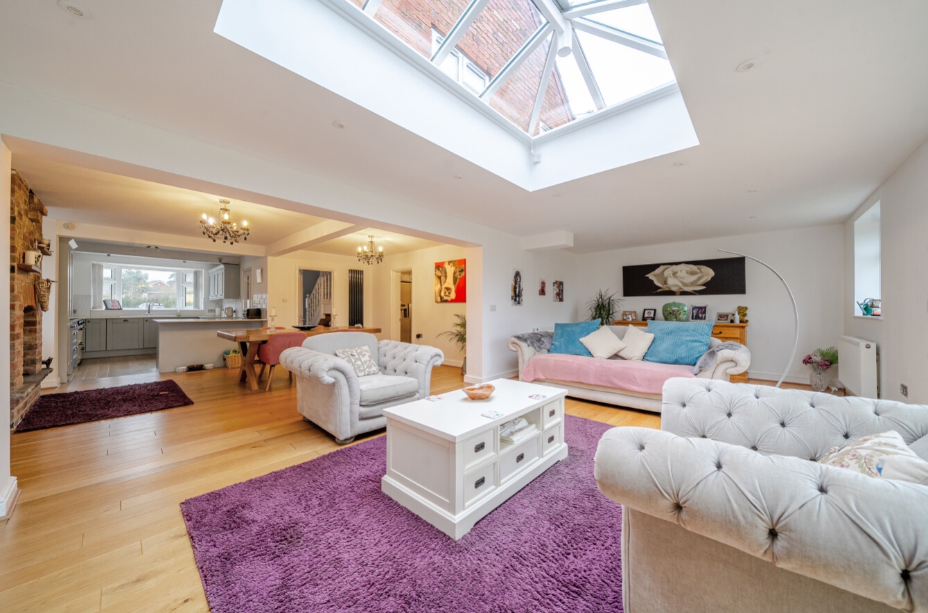 The property itself is a characterful home that has been beautifully modernised and is presented to an exceptional standard throughout. The spacious and versatile accommodation begins with a welcoming entrance hall which leads to a study or home office, ideal for modern family living. The heart of the home is the stunning open plan kitchen, dining and sitting room. The kitchen has been recently fitted with modern low and eye level units complemented by granite worktops, a breakfast bar, Belling range cooker with gas hob, and integrated dishwasher and fridge. This flows seamlessly into the dining area which features a cosy log burner, before opening into the sitting room where a striking lantern roof and bi-fold doors create a light-filled space with direct access to the rear garden. Completing the ground floor is a practical utility room with space for several appliances, providing access to a cloakroom and the double garage.