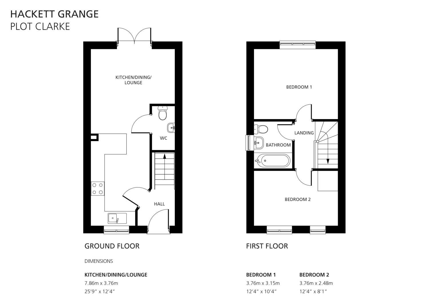 The Clarke Design – The front door of this home opens on to the hall, which leads on to the modern kitchen/dining/lounge with its built-in oven, hob and hood and French doors opening on the rear enclosed garden, which will be freshly turfed. The ground floor also boasts a downstairs WC. The first floor has two bedrooms and a bathroom fitted with a modern three-piece suit. The property has two allocated parking spaces.