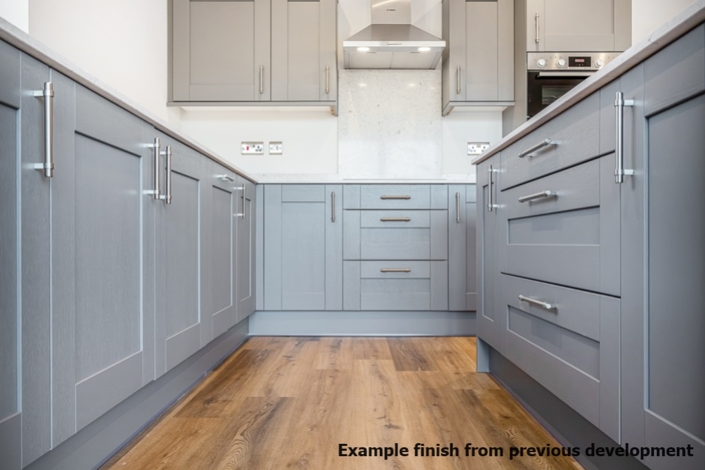 Internally, the homes will feature oak internal doors, high-quality floor finishes throughout, and contemporary fitted kitchens complete with quartz worktops, upstands and splashbacks to the hob. Kitchens will include a full range of integrated appliances, including fridge freezer, dishwasher, induction hob, cooker hood, and a single/compact oven with microwave. Composite undermounted sinks further enhance the clean, modern aesthetic. Separate utility areas provide space for a washing machine and dryer, along with additional quartz worktops and composite sinks.
